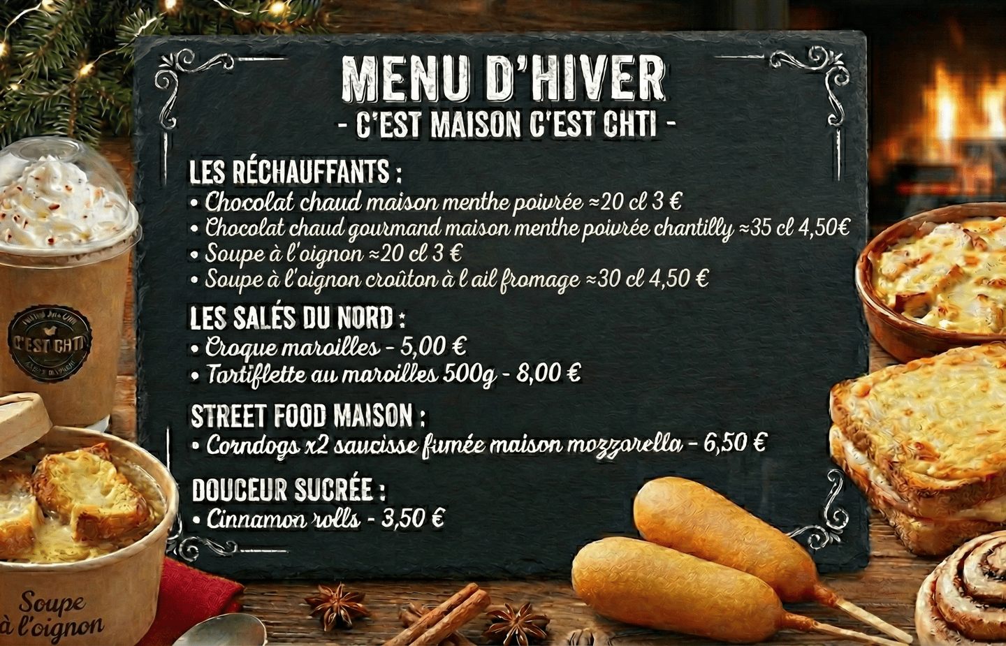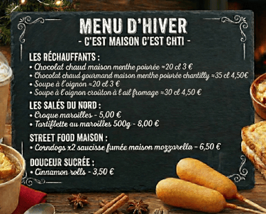 Savourez nos délices festifs, du chocolat chaud maison aux tartiflettes généreuses.